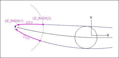 用两个半径定义 LE 区域。两条围绕前缘点摆动的弧与叶背和叶盆相交。此类区域是位于相交点区域内的曲线的一部分。有以下两个区域: