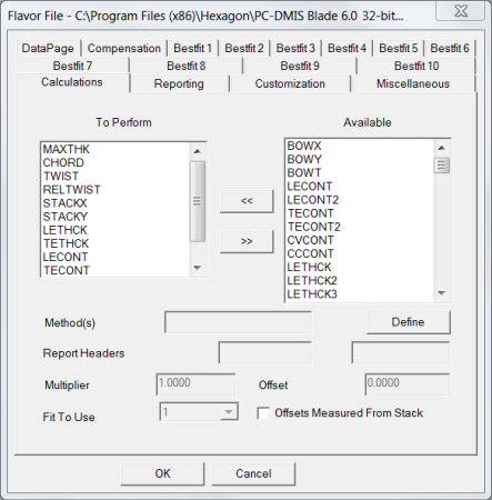 使用算法文件对话框中的计算选项卡添加并删除不同计算,并定义PC-DMIS Blade用于分析的方法。下面描述的计算修改符也可以影响计算。