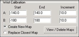 Pro kalibraci zápěstí je potřeba kalibrovat polohy zápěstí ve vzoru nejméně tří poloh úhlu A nejméně třemi polohami úhlu B pro celkem devět měření koule. Oblast Kalibrace zápěstí umožní zadat úhly pro kalibraci obou os A a B. Použijte pole Začátek, Konec a Přírůstek k zadání počátečních a koncových úhlů pro mapování zápěstí a přírůstek pro mapování obou os A a B.
