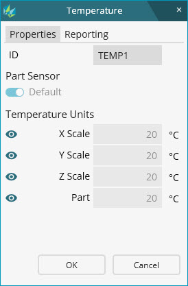 Oblast Jednotky teploty - Pole Stupnice X, Stupnice Y, Stupnice Z a Díl zobrazují aktuální měřené teploty. Hodnoty nemůžete měnit. Jednotky teploty a výchozí číslo snímače jsou podle výběru v Upravit | Preference | Nastavení kompenzace teploty.