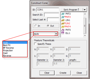 PC-DMIS poskytuje k sestrojení kužele několik metod. Následující tabulka uvádí různé typy sestrojených kuželů s nezbytnými vstupy. Pro některé prvky není zadání vstupu vůbec nutné, u jiných je nutné provést šest a více zadání. Termín „Jakýkoli“ v tabulce dole znamená, že konstrukce může vzít pro sestrojení jako vstup jakýkoli prvek. PC-DMIS umožňuje vybrat prvky v jakémkoli pořadí.