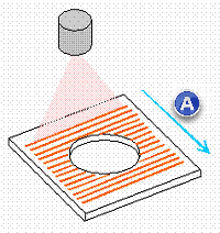 PC-DMIS má k dispozici dvě rozdílné cesty pro kružnici. Automaticky vybírá vhodnou cestu v závislosti na průměru a velikosti použitelné části laserového pruhu. Pro automatické prvky PC-DMIS vžde skenuje kolmo ke směru pruhu.