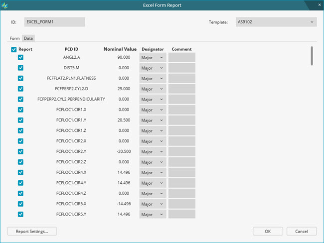 Záložka zobrazuje sloupce Protokol, PCD ID, Nominální hodnota a vlastního pole. Sloupec vlastního pole může být více než jeden v závislosti na tom, co jste vytvořili a přidružili na záložce Formulář. Sloupce PCD ID a Nominální identifikují rozměry. Hodnoty nemůžete upravovat.