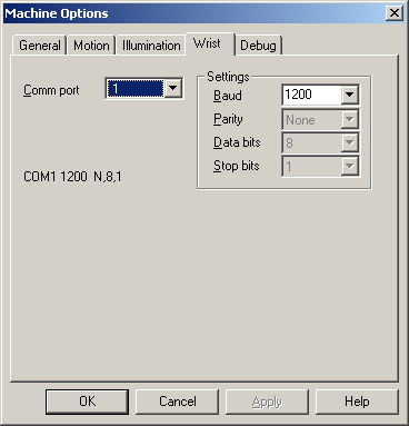 Záložka Zápěstí vám umožňuje zadat komunikační port a nastavení použitá pro připojení počítače na ovladač zápěstí přístroje optického měření. Toto platí pro přístroje Vision, které mají připojen typ zápěstí PH9 a zaškrtnutou možnost licence LMS nebo hardwarového klíče Zápěstí (např. Mycrona).