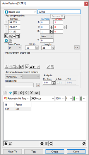Klikněte na Vytvořit v dialogovém okně Automatický prvek pro přidání zaoblené štěrbiny do rutiny měření.