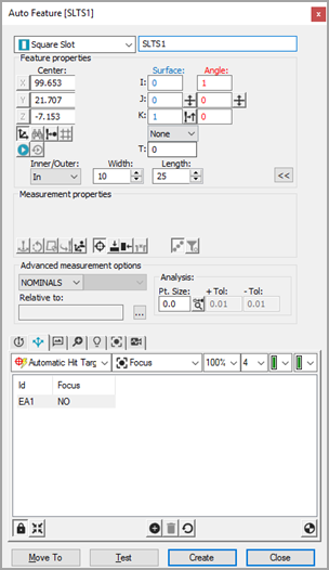 Klikněte na Vytvořit v dialogovém okně Automatický prvek pro přidání hranaté štěrbiny do rutiny měření.