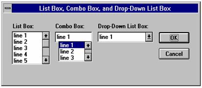 Begin Dialog BoxSample 16,35,256,89,"List Box, Combo Box, and Drop-Down List Box"