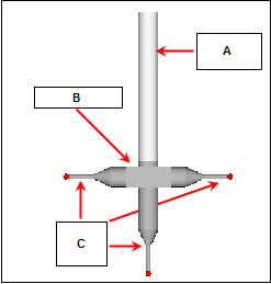 Use this option to error map a probe head or a wrist device. This section describes error mapping an indexing probe head, such as the PH9, PH10, or Zeiss RDS. A special probe configuration, consisting of three styli of the same diameter, is placed in the probe head and as many tip orientations (all possible orientations are best) that the user desires are measured with this probe configuration. Generally, you should arrange the styli in a "T" configuration at least 20 mm tall and 40 mm wide (like a star probe with styli at 20 mm from the center). The farther the styli are separated, the more accurate is the error map.