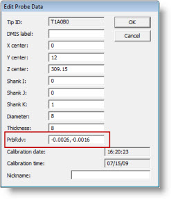 To view or manually edit the SCNRDV, select the desired tip in the Probe Utilities dialog and click the Edit button. The Edit Probe Data dialog box appears with the PrbRdv box containing both the PRBRDV and SCNRDV values separated by commas, like this: