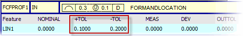 PC-DMIS takes the total tolerance of 0.3 and subtracts the plus tolerance of 0.1, leaving you with a minus tolerance of 0.2, as shown here: