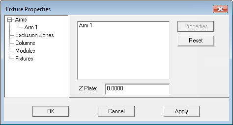 The Fixture Properties dialog box displays properties that are relevant to the option selected from the tree on the left sidebar of the dialog box. For example, selecting Arm 1 from the left pane shows the properties for that arm.