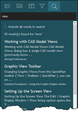 From the list of possible matches that appear, click a topic from the list to view it in the Topics Pane. The Help system highlights all the terms that match your typed selection. You can scroll down the list of topics to load more topics that the search found.