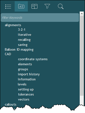 Click the Index tab to see a list of all the keyword index entries. Type a possible index term in the Filter Keywords box. As you type, the list dynamically updates based on your entry. If you can't find a topic for the term you're using, try using a different but similar word. If you still can't find a topic, try using the Search tab.