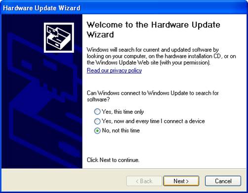 The Hardware Update Wizard screen appears. Select the No, not this time option and then click Next: