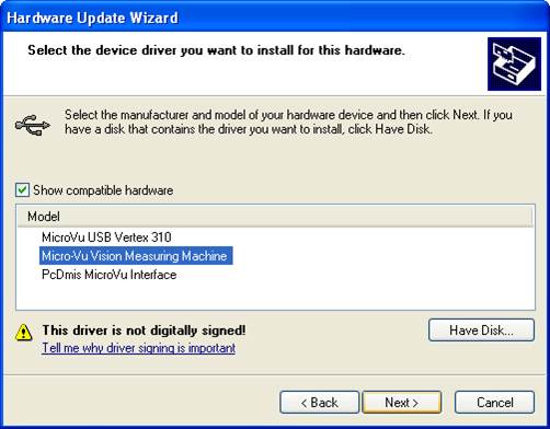 Select the option to browse from a specific folder to install the driver manually. The intent is to use the original Micro-Vu device driver before the PC-DMIS upgrade.