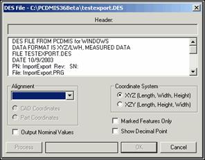 To export this file, select File | Export | DES. Choose where you want to place the file, and click Export. PC-DMIS displays the DES File dialog box.
