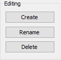 The Editing area allows you to modify CAD groups. For all buttons except Create, you need to first select at least one group from the CAD groups list, and the buttons affect the selected group or groups.