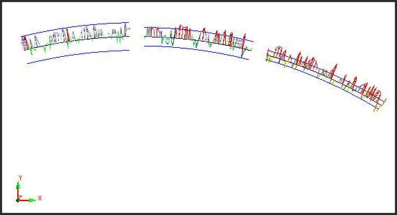PC-DMIS handles reports of multiple scans with profile FCFs at different tolerances that are evaluated simultaneously in such a way that the tolerances for individual FCFs are shown in the report. For example, in the image below, the simultaneous evaluation of three profile FCF dimensions (PRF1, PRF2, and PRF3) appears like this: