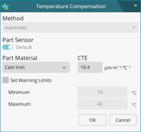 Per compensare la misurazione per una temperatura diversa da 20°C come richiesto da ISO-1, selezionare Inserisci | Modifica parametro | Compensazione temperatura. Verrà visualizzata la seguente finestra di dialogo: