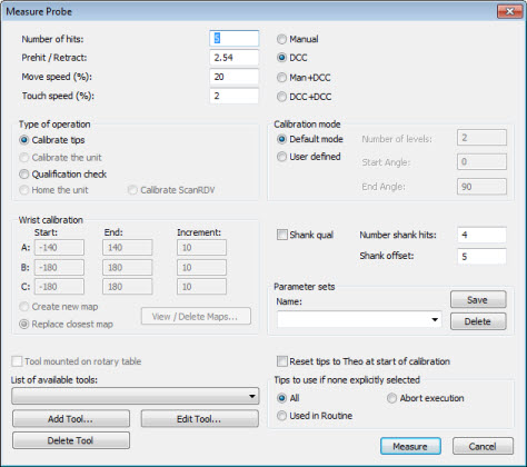 Il pulsante di comando Misura consente di calibrare le punte del tastatore selezionate nel riquadro Punte attive della finestra di dialogo Utility tastatore. Quando si fa clic, verrà visualizzata la finestra di dialogo Misura tastatore.