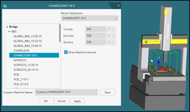 Selezionare una macchina nell'elenco delle macchine. PC-DMIS mostra automaticamente l'anteprima della macchina. PC-DMIS crea anche automaticamente il nome temporaneo di una macchina personalizzata nella casella Nome macchina personalizzata. Il nome è quello della macchina precedeuto dal prefisso "Custom_".