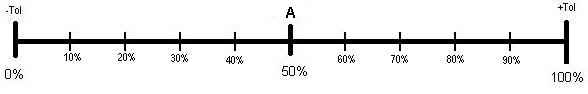 Per zona di tolleranza si intende un intervallo compreso tra lo 0 e il 100%, similmente a come i colori di dimensione vengono applicati alle zone di tolleranza e i grafici a barre a colori vengono disegnati alla fine delle dimensioni). Il limite inferiore (nominale - tolleranza negativa) corrisponde allo 0% e il limite superiore (nominale + tolleranza positiva) corrisponde al 100%. Considerare il seguente grafico dove A, al centro del grafico, rappresenta il valore nominale: