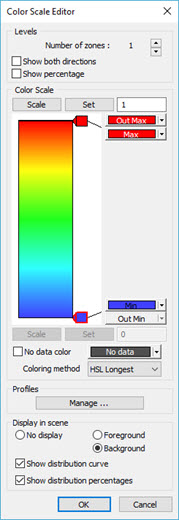 Il pulsante Modifica la scala dei colori è disponibile nella finestra di dialogo Operatore nuvola di punti degli operatori Mappa colori punti e Mappa colori superficie. Permette di cambiare la scala dei colori di questi operatori. Per impostazione predefinita, i valori Min/Max della scala sono impostati sui valori delle tolleranze positiva e negativa della mappa dei colori. Usando questa funzione è possibile salvare e richiamare diverse barre dei colori.