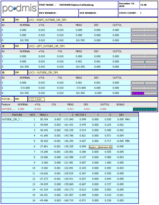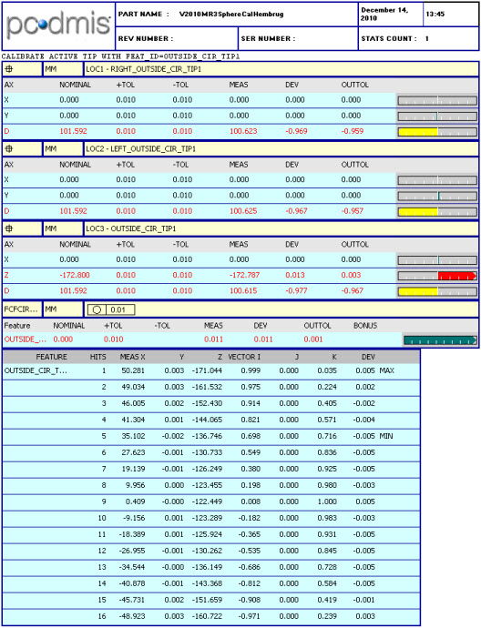 Ripartendo di nuovo dai valori nominali della punta e della tavola rotante e usando le dimensioni mostrate sopra, PC-DMIS produce il seguente rapporto.