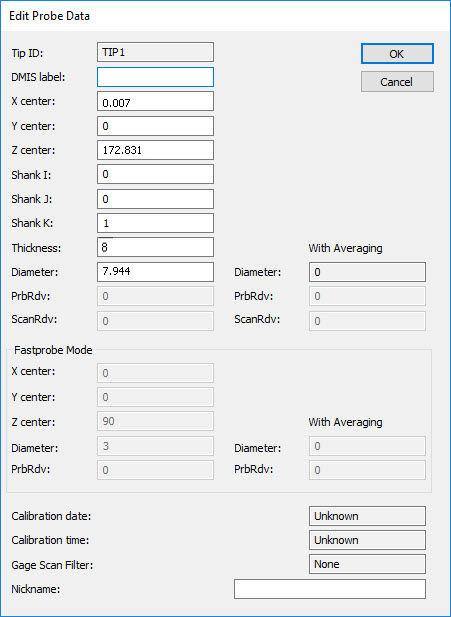 Nella finestra di dialogo Utility tastatore fare clic sulla punta attiva nell'elenco, poi fare clic sul pulsante Modifica per aprire la finestra di dialogo Modifica dati tastatore mostrata sotto per vedere i valori aggiornati.