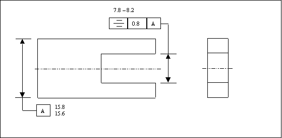 크기와 RFS의 한계내에서, 슬롯의 반대쪽 요소의 모든 중앙 지점은 반드시 0.8 만큼 떨어진 두개의 평행 평면 사이에 있어야 하고, 두 평면은 데이타 평면 A 주위에서 동일하게 위치하고 있다. 명시된 공차와 데이타 참조는 RFS 으로만 적용할 수 있다.