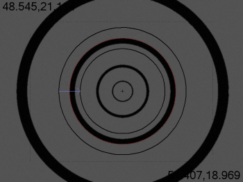 동일 중심면 / 동일 초점면 정확도 를 위해, 높은 을 선택했다면, PC-DMIS 비전은 "Hexagon 표준 동심원을 대상에 정렬" 하라는 메시지를 준다. 아래의 이미지와 같이 원을 정렬하고 OK 를 클릭한다.