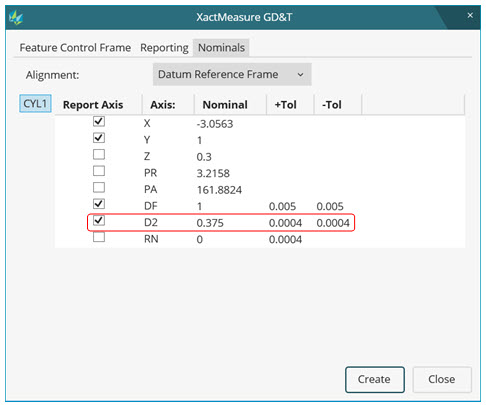 PC-DMIS 根据每个基准的测量大小,以及标称选项卡中指定的 D2 轴(第二基准)的正负公差,计算复合基准中每个基准的公差: