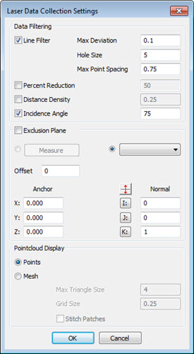 使用激光数据收集设置对话框可定义数据筛选的类型、隔离面以及激光扫描数据的点云显示。