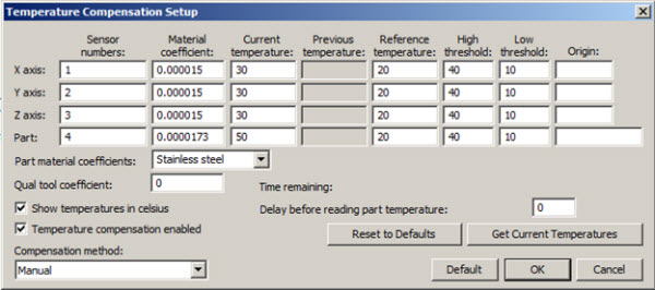 在此模式中,当测量例程运行时,屏幕上将不显示温度补偿设置对话框。当前温度将从控制器变量中读取。这些变量是基于变量地址的变量偏置传感器数量。轴和零件温度补偿信息包括应在编程过程中正确定义的传感器数量。