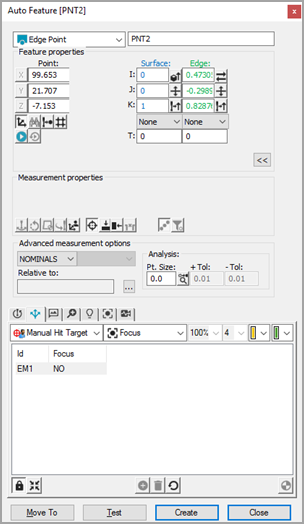 PC-DMIS 影像测量 自动将点的标称数据填入自动特征对话框。将自动显示棱点的触测目标。