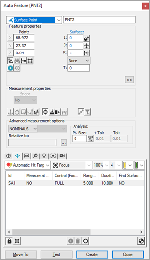 单击自动特征对话框上的创建,将曲面点添加至测量例程。