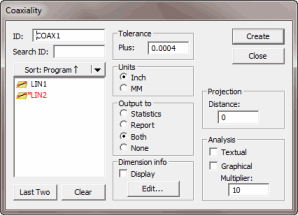 插入|尺寸|同轴度菜单选项用于计算柱体、锥体或直线与基准特征的同轴度。输入的第二个特征始终是基准特征,它可以是柱体、锥体、直线或圆。如果只选中一个特征然后点击创建按钮,PC-DMIS将会清空列表框然后提示您需要第二个特征。