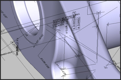 顯示 CAD 模式視圖的部分 CATIA 模型(GD&T 或其他類似文本 CAD 元素)