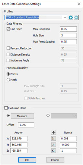 The Laser Data Collection Settings dialog box allows you to select a scan profile, define and save scan profiles. You can also define the exclusion plane, and the pointcloud display for laser scanned data.