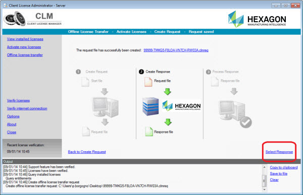 Complete the offline license activation procedure by transferring the activation .clmresp file back to the computer you are licensing. The CLM application processes the file.