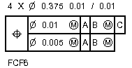 When you select the Composite check box, the Feature Control Frame becomes a composite callout. In a composite callout, the symbol spans across the rows, like this: