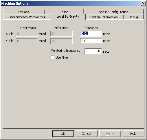 公差 - 指明在认可的公差范围内,Nivel 水平以毫弧度为单位可以改变的角度。否则,需要使用选项选项卡中的重置 Nivel 选项。