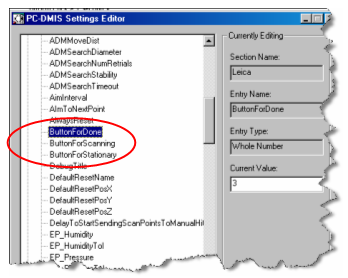 根据需要,您也可在 PC-DMIS 设置编辑器中更改 T 测头的标准按钮分配。要执行该操作,仅需将每个 Leica 按钮条目的编号,更改为所需的 T 测头按钮的编号。