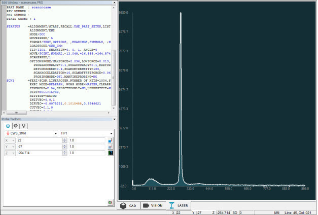 如果测量例程中的活动测尖是色差白光传感器 (CWS),PC-DMIS 影像测量 将添加一个带有频谱图的激光选项卡。软件未执行测量例程时,频谱图显示 CWS 信号(“噪音”)的结构。这有助于选择照明和频度等参数的最佳设置。