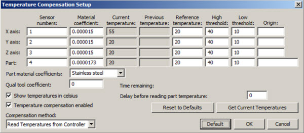 In this mode, the Temperature Compensation Setup dialog box does not appear when you run the measurement routine. The current temperatures are read from the controller variables. These variables are the variable offset sensor numbers that are based on the variable addresses. The axes and part temperature compensation information includes the sensor numbers. You should correctly define the information during the programming process.