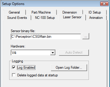 Setup Options dialog box - Laser Sensor tab example pointing to the binary file for Perceptron sensors