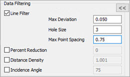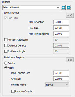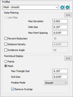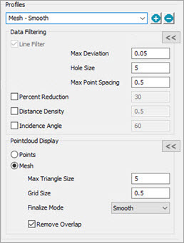 The Profiles section of the Laser Data Collection Settings dialog box allows you to select from a list of pre-configured scan profiles. You can also create your own scan profiles. You must use the Line Filter when scanning with the Mesh display option.