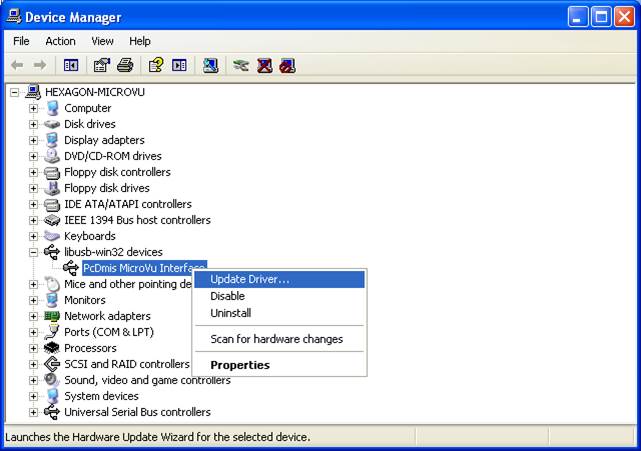 The Device Manager screen appears. Select PcDmis MicroVu Interface, right-click, and select Update Driver: