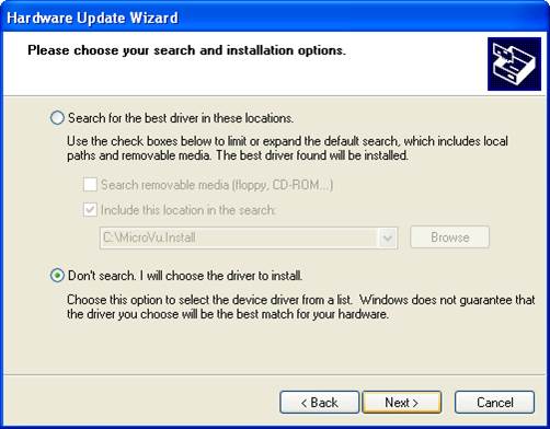 Select the option to browse from a specific folder to install the driver manually. The intent is to use the original Micro-Vu device driver before the PC-DMIS upgrade.