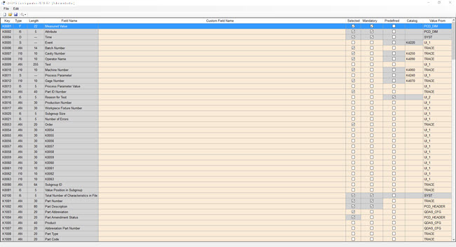 From Q-DAS Configurator, select Setup | K-Field Configuration to open the Setup K-Field Configuration dialog box. It displays all of the supported K-fields in a table format: